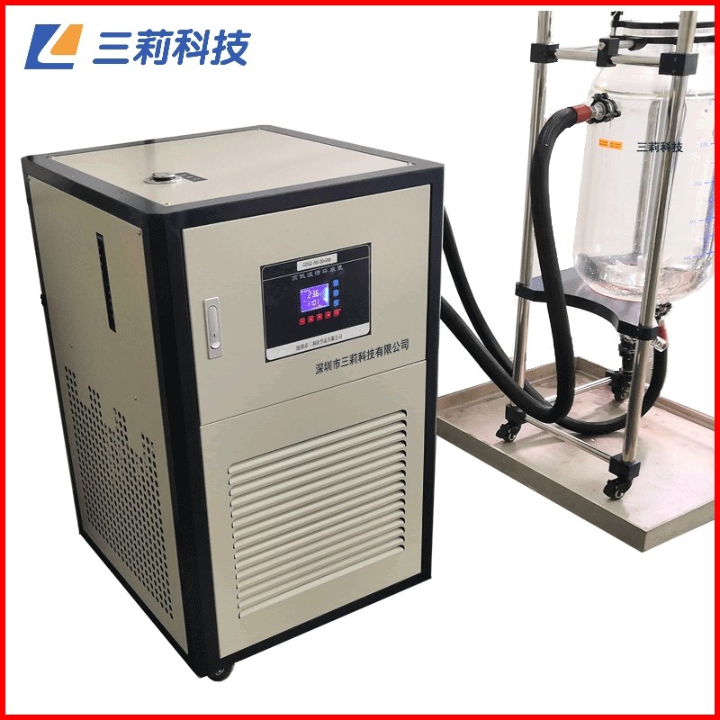 制冷部分是利用全封閉壓縮機(jī)機(jī)械制冷,板式換熱器、膨脹閥、壓力保護(hù)器等組成以達(dá)到降溫要求;加熱部分是利用電加熱管對(duì)循環(huán)液進(jìn)行加熱。并通過內(nèi)置循環(huán)泵、外接循環(huán)管路將冷媒或熱媒輸送到配套設(shè)備夾層內(nèi),間接為反應(yīng)器內(nèi)物料進(jìn)行降溫及加熱反應(yīng)。