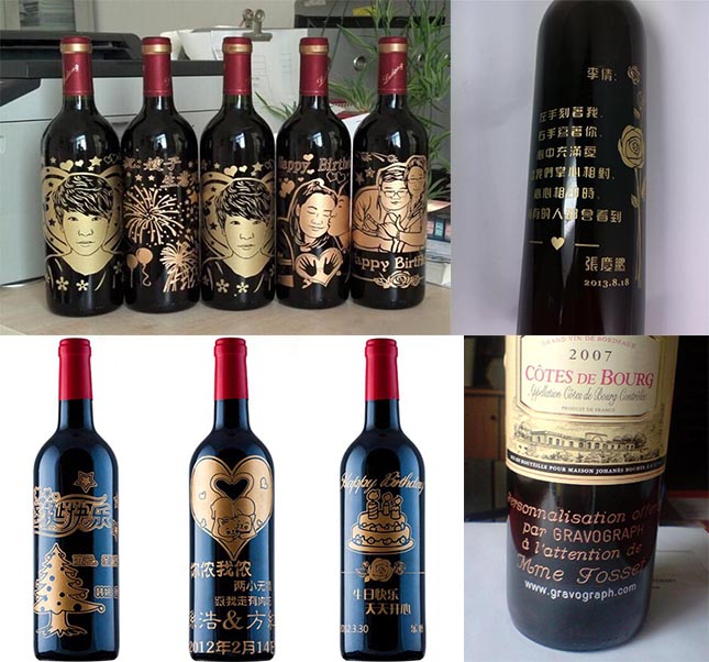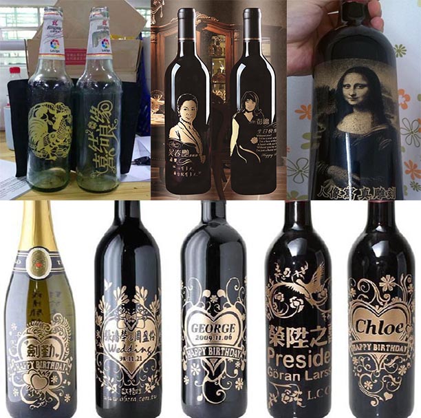 使用激光雕刻的圖文字畫不易消失,不用擔心被篡改;激光本身是無接觸加工,不會對酒瓶本身造成破壞;不管圖文字畫還是影雕,都形象逼真,精細光滑,不管酒瓶是何種不規則形狀,激光雕刻機都可以解決。