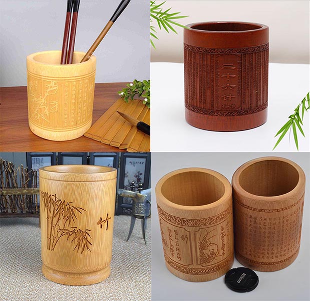 筆筒大部分是采用竹木材料制作的,以天然竹木作為原材料,后期借以現代激光雕刻技術進行雕琢,尤其是雕刻一些詩詞歌賦、字畫書法,給書房更是增添不一樣的文化氛圍。
