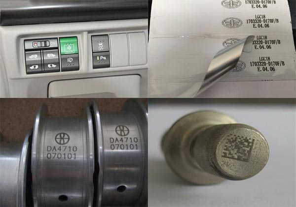 激光打標(biāo)應(yīng)用于汽車行業(yè)其主要的功能為產(chǎn)品的管理及追溯,標(biāo)刻的內(nèi)容大致為零件號、批號、流水號、二維碼等內(nèi)容,神繪激光的激光打標(biāo)機(jī)已在國內(nèi)大多數(shù)汽車零部件企業(yè)推廣應(yīng)用。